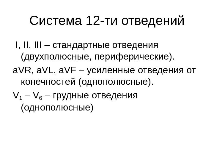Система 12 -ти отведений I, III – стандартные отведения (двухполюсные, периферические). a. VR, a. VL, a. VF – усиленные отведения от конечностей (однополюсные). V 1 – V 6 – грудные отведения (однополюсные)