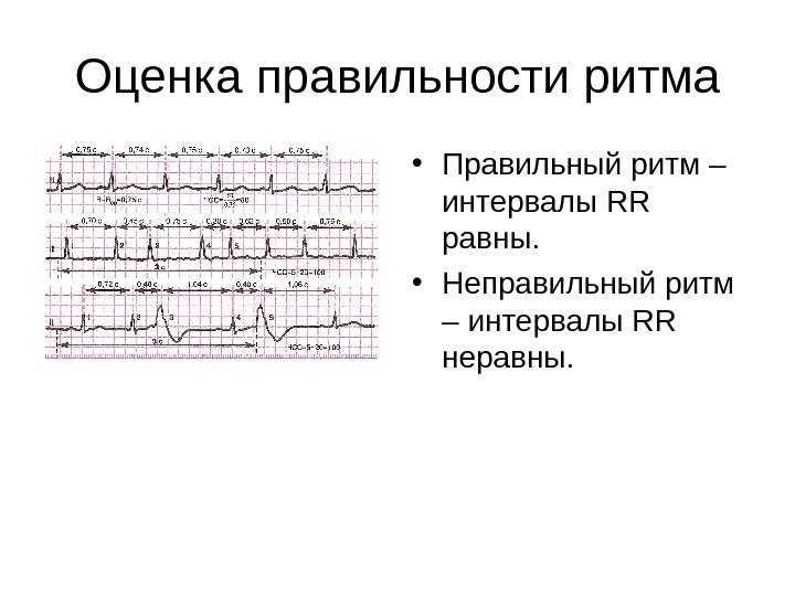 Оценка правильности ритма • Правильный ритм – интервалы RR равны. • Неправильный ритм – интервалы RR неравны.