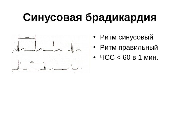 Синусовая брадикардия • Ритм синусовый • Ритм правильный • ЧСС < 60 в 1 мин.
