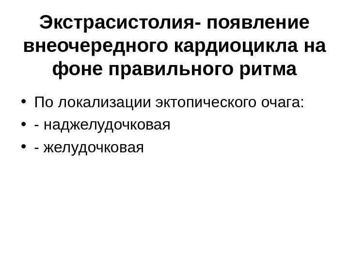 Экстрасистолия- появление внеочередного кардиоцикла на фоне правильного ритма • По локализации эктопического очага: • — наджелудочковая • — желудочковая