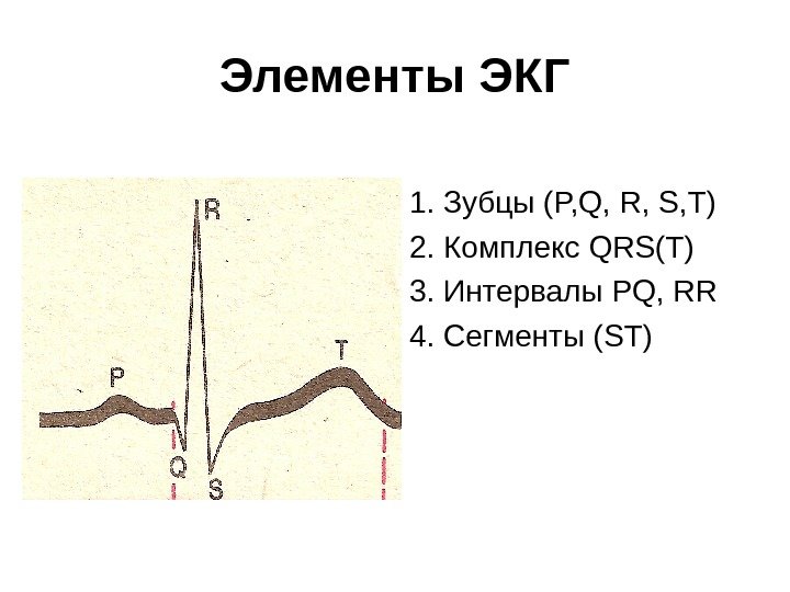 Элементы ЭКГ 1. Зубцы ( P, Q, R, S, T) 2. Комплекс QRS(T) 3. Интервалы PQ, RR 4. Сегменты ( ST )