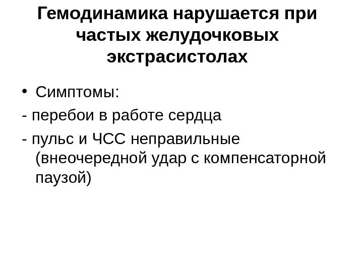Гемодинамика нарушается при частых желудочковых экстрасистолах • Симптомы: — перебои в работе сердца — пульс и ЧСС неправильные (внеочередной удар с компенсаторной паузой)