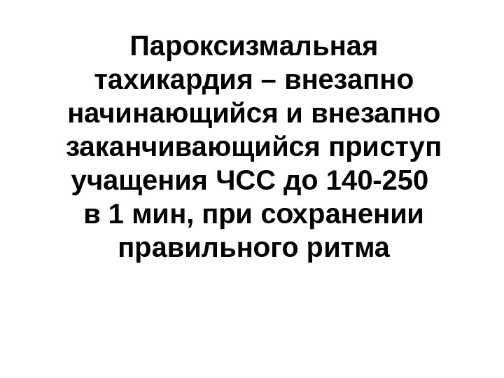 Пароксизмальная тахикардия – внезапно начинающийся и внезапно заканчивающийся приступ учащения ЧСС до 140 -250 в 1 мин, при сохранении правильного ритма