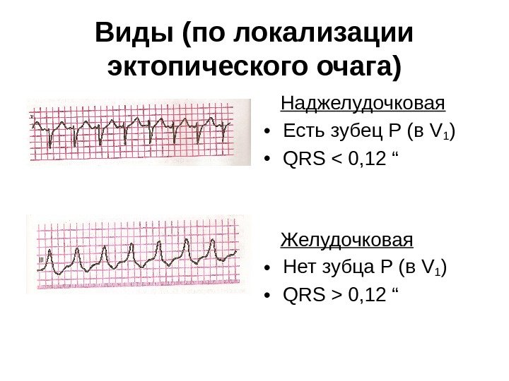 Виды (по локализации эктопического очага) Наджелудочковая • Есть зубец Р (в V 1 ) • QRS 0, 12 “