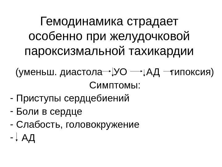 Гемодинамика страдает особенно при желудочковой пароксизмальной тахикардии (уменьш. диастола УО АД гипоксия) Симптомы: — Приступы сердцебиений — Боли в сердце — Слабость, головокружение — АД