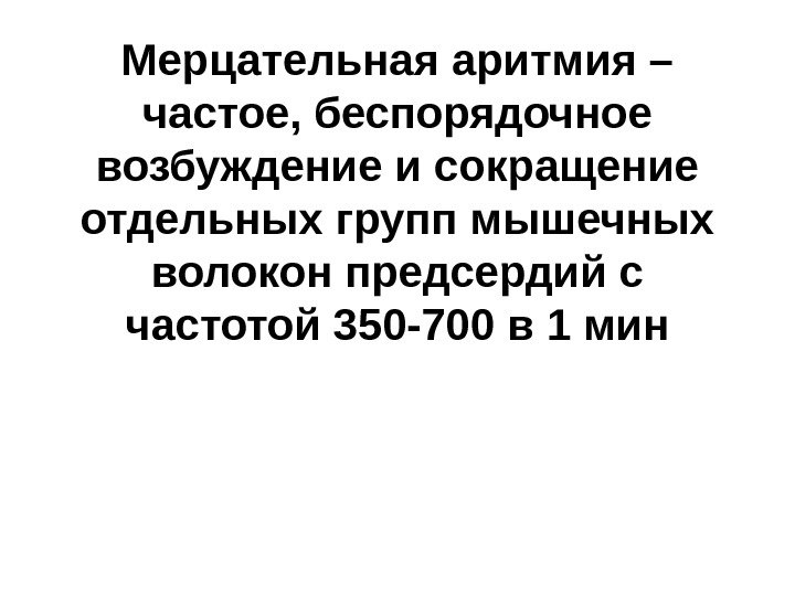 Мерцательная аритмия – частое, беспорядочное возбуждение и сокращение отдельных групп мышечных волокон предсердий с частотой 350 -700 в 1 мин