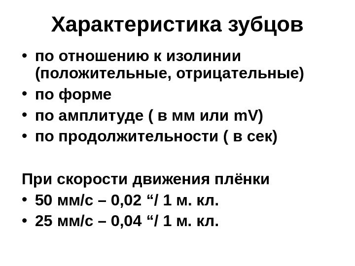 Характеристика зубцов • по отношению к изолинии (положительные, отрицательные) • по форме • по амплитуде ( в мм или m. V) • по продолжительности ( в сек) При скорости движения плёнки • 50 мм/с – 0, 02 “/ 1 м. кл. • 25 мм/с – 0, 04 “ / 1 м. кл.