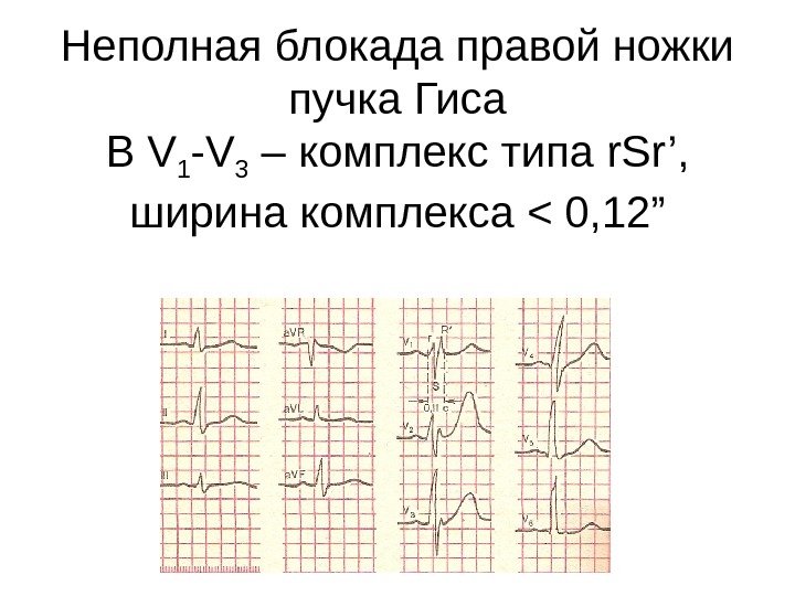 Неполная блокада правой ножки пучка Гиса В V 1 -V 3 – комплекс типа r. Sr’, ширина комплекса < 0, 12”