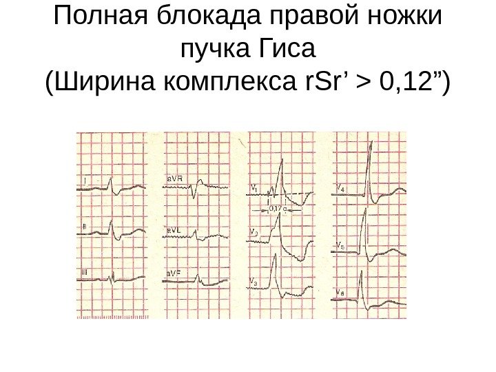 Полная блокада правой ножки пучка Гиса ( Ширина комплекса r. Sr’ > 0, 12”)