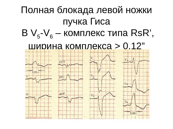 Полная блокада левой ножки пучка Гиса В V 5 -V 6 – комплекс типа RR’, ширина комплекса > 0, 12”