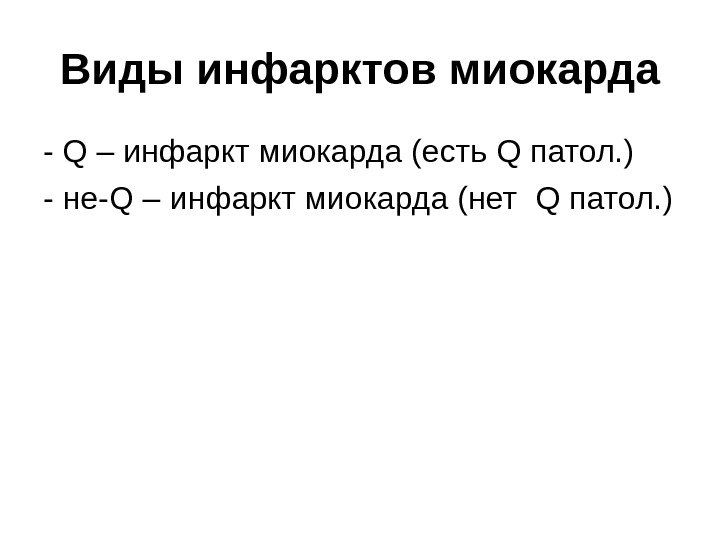 Виды инфарктов миокарда — Q – инфаркт миокарда (есть Q патол. ) — не- Q – инфаркт миокарда (нет Q патол. )