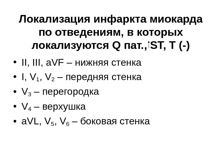 Локализация инфаркта миокарда по отведениям, в которых локализуются Q пат. , ST, T (-) • II, III, a. VF – нижняя стенка • I, V 1 , V 2 – передняя стенка • V 3 – перегородка • V 4 – верхушка • a. VL, V 5 , V 6 – боковая стенка