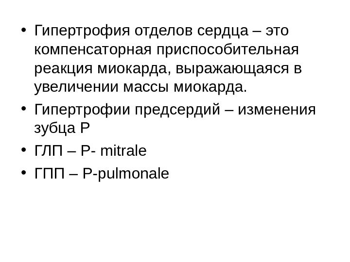 • Гипертрофия отделов сердца – это компенсаторная приспособительная реакция миокарда, выражающаяся в увеличении массы миокарда. • Гипертрофии предсердий – изменения зубца Р • ГЛП – Р- mitrale • ГПП – Р- pulmonale