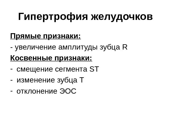 Гипертрофия желудочков Прямые признаки: — увеличение амплитуды зубца R Косвенные признаки: — смещение сегмента ST — изменение зубца Т — отклонение ЭОС