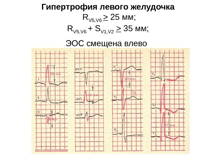 Гипертрофия левого желудочка R V 5, V 6 > 25 мм; R V 5, V 6 + S V 1, V 2 > 3 5 мм; ЭОС смещена влево