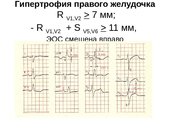 Гипертрофия правого желудочка R V 1, V 2 > 7 мм; — R V 1, V 2 + S V 5, V 6 > 11 мм, ЭОС смещена вправо