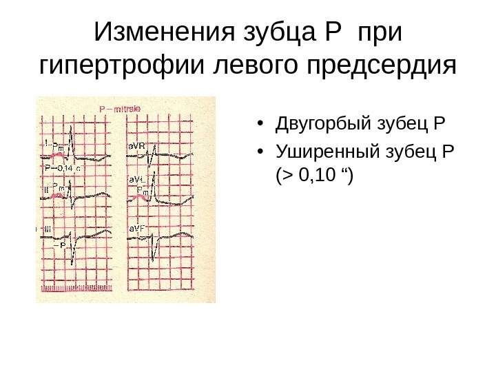 Изменения зубца P при гипертрофии левого предсердия • Двугорбый зубец Р • Уширенный зубец Р ( > 0, 10 “)