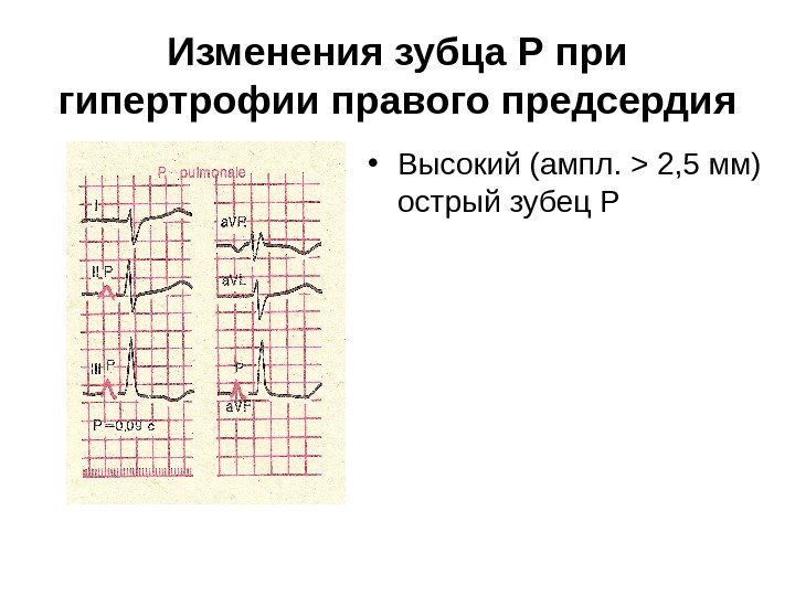 Изменения зубца Р при гипертрофии правого предсердия • Высокий (ампл. > 2, 5 мм) острый зубец Р