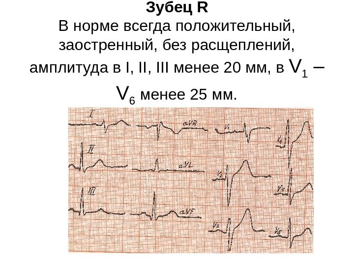 Зубец R В норме всегда положительный, заостренный, без расщеплений, амплитуда в I, III менее 20 мм, в V 1 – V 6 менее 25 мм.