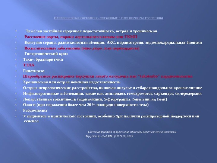 Некоронарные состояния, связанные с повышением тропонина ۰ Тяжёлая застойная сердечная недостаточность, острая и хроническая ۰ Расслоение аорты, пороки аортального клапана или ГКМП ۰ Контузия сердца, радиочастотная абляция, ЭКС, кардиоверсия, эндомиокардиальная биопсия ۰ Воспалительные заболевания (мио-, эндо-, или перикардиты) ۰ Гипертонический криз ۰ Тахи-, брадиаритмии ۰ ТЭЛА ۰ Гипотиреоз ۰ Шарообразное расширение верхушки левого желудочка или «takotsubo» кардиомиопатия ۰ Хроническая или острая почечная недостаточность ۰ Острые неврологические расстройства, включая инсульт и субарахноидальное кровоизлияние ۰ Инфильтративные заболевания, такие как амилоидоз, гемохроматоз, саркоидоз, склеродермия ۰ Лекарственная токсичность (адриамицин, 5 -фторурацил, гецептин, яд змей) ۰ Ожоги (при поражении более чем 30% площади поверхности тела) ۰ Рабдомиолиз ۰ У пациентов в критическом состоянии, особенно при наличии респираторной поддержки или сепсиса Universal definition of myocardial infarction. Expert consensus document. Thygesen K. et al. EHJ (2007) 28,