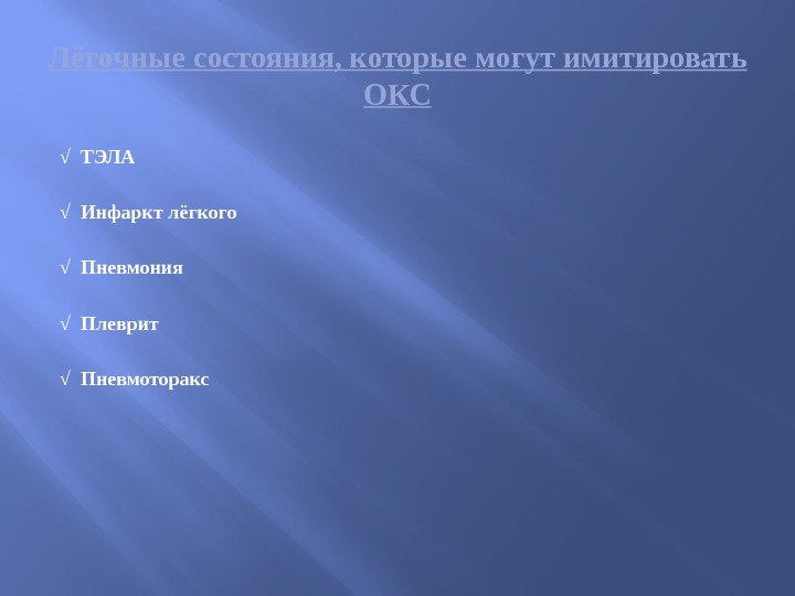 Лёгочные состояния, которые могут имитировать ОКС √ ТЭЛА √ Инфаркт лёгкого √ Пневмония √ Плеврит √ Пневмоторакс