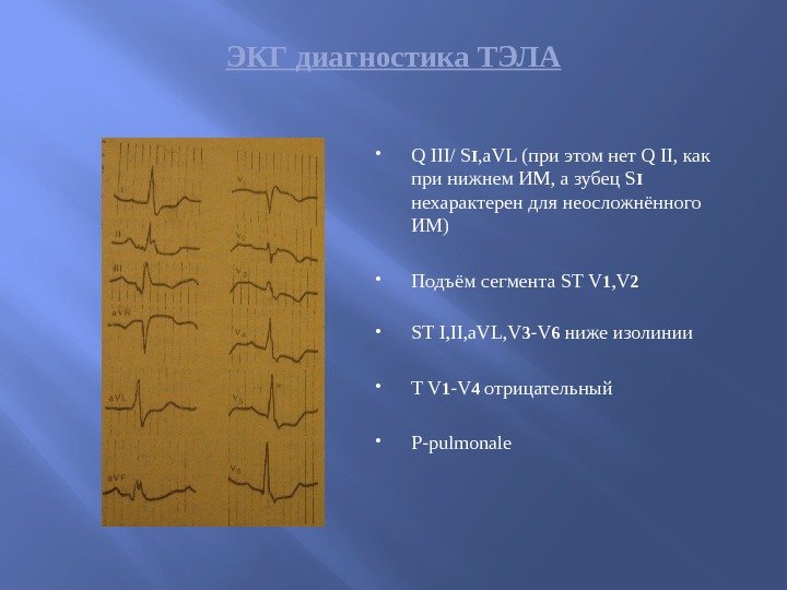 ЭКГ диагностика ТЭЛА Q III/ S I , a. VL (при этом нет Q II, как при нижнем ИМ, а зубец S I нехарактерен для неосложнённого ИМ) Подъём сегмента ST V 1 , V 2 ST I, II, a. VL, V 3 -V 6 ниже изолинии T V 1 -V 4 отрицательный P-pulmonale