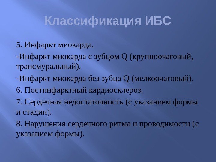 Классификация ИБС 5. Инфаркт миокарда. -Инфаркт миокарда с зубцом Q (крупноочаговый, трансмуральный). -Инфаркт миокарда без зубца Q (мелкоочаговый). 6. Постинфарктный кардиосклероз. 7. Сердечная недостаточность (с указанием формы и стадии). 8. Нарушения сердечного ритма и проводимости (с указанием формы).