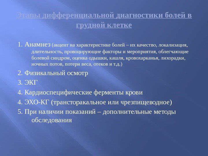 Этапы дифференциальной диагностики болей в грудной клетке 1. Анамнез (акцент на характеристике болей – их качество, локализация, длительность, провоцирующие факторы и мероприятия, облегчающие болевой синдром, оценка одышки, кашля, кровохарканья, лихорадки, ночных потов, потери веса, отеков и т. д. ) 2. Физикальный осмотр 3. ЭКГ 4. Кардиоспецифические ферменты крови 4. ЭХО-КГ (трансторакальное или чрезпищеводное) 5. При наличии показаний – дополнительные методы обследования