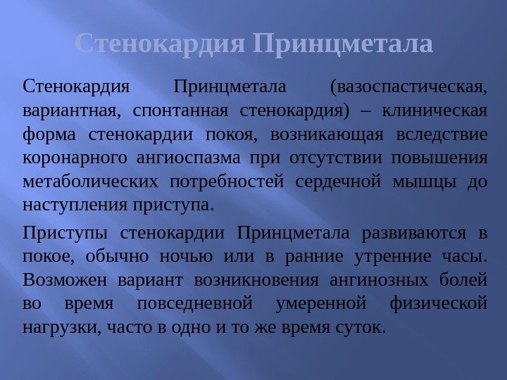 Стенокардия Принцметала (вазоспастическая, вариантная, спонтанная стенокардия) – клиническая форма стенокардии покоя, возникающая вследствие коронарного ангиоспазма при отсутствии повышения метаболических потребностей сердечной мышцы до наступления приступа. Приступы стенокардии Принцметала развиваются в покое, обычно ночью или в ранние утренние часы. Возможен вариант возникновения ангинозных болей во время повседневной умеренной физической нагрузки, часто в одно и то же время суток.