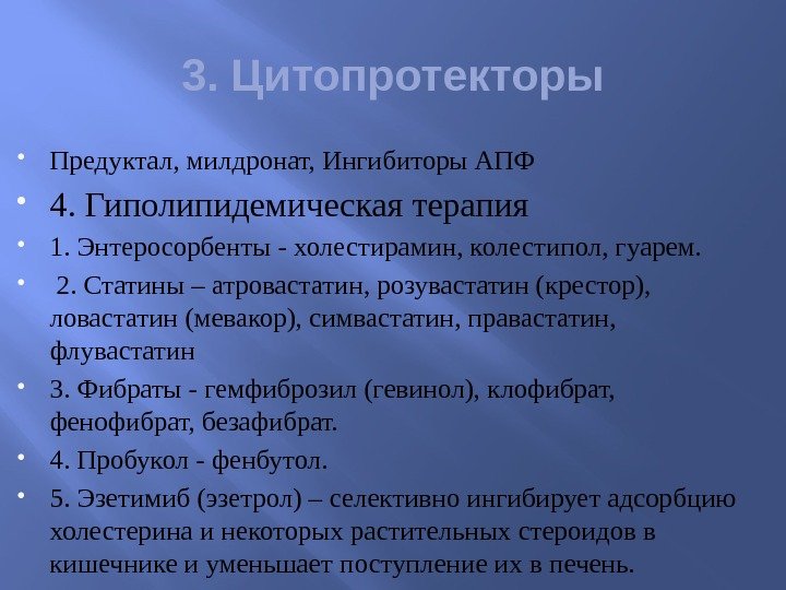 3. Цитопротекторы Предуктал, милдронат, Ингибиторы АПФ 4. Гиполипидемическая терапия 1. Энтеросорбенты — холестирамин, колестипол, гуарем. 2. Статины – атровастатин, розувастатин (крестор), ловастатин (мевакор), симвастатин, правастатин, флувастатин 3. Фибраты — гемфиброзил (гевинол), клофибрат, фенофибрат, безафибрат. 4. Пробукол — фенбутол. 5. Эзетимиб (эзетрол) – селективно ингибирует адсорбцию холестерина и некоторых растительных стероидов в кишечнике и уменьшает поступление их в печень.