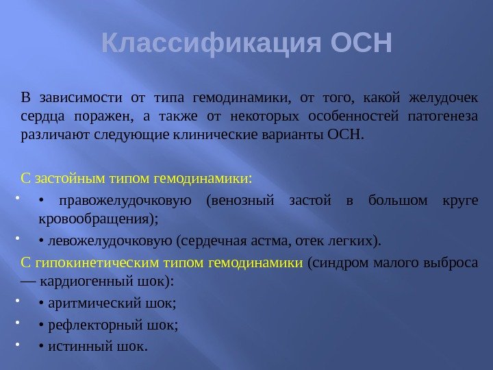 Классификация ОСН В зависимости от типа гемодинамики, от того, какой желудочек сердца поражен, а также от некоторых особенностей патогенеза различают следующие клинические варианты ОСН. С застойным типом гемодинамики: • правожелудочковую (венозный застой в большом круге кровообращения); • левожелудочковую (сердечная астма, отек легких). С гипокинетическим типом гемодинамики (синдром малого выброса — кардиогенный шок): • аритмический шок; • рефлекторный шок; • истинный шок.