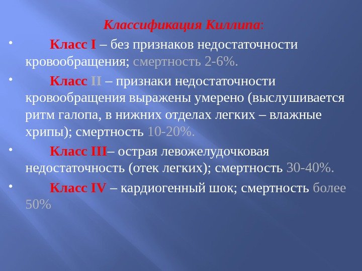 Классификация Киллипа : Класс I – без признаков недостаточности кровообращения; смертность 2 -6%. Класс II – признаки недостаточности кровообращения выражены умерено (выслушивается ритм галопа, в нижних отделах легких – влажные хрипы); смертность 10 -20%. Класс III – острая левожелудочковая недостаточность (отек легких); смертность 30 -40%. Класс IV – кардиогенный шок; смертность более 50%