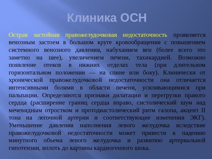 Клиника ОСН Острая застойная правожелудочковая недостаточность проявляется венозным застоем в большом круге кровообращения с повышением системного венозного давления, набуханием вен (более всего это заметно на шее), увеличением печени, тахикардией. Возможно появление отеков в нижних отделах тела (при длительном горизонтальном положении — на спине или боку). Клинически от хронической правожелудочковой недостаточности она отличается интенсивными болями в области печени, усиливающимися при пальпации. Определяются признаки дилатации и перегрузки правого сердца (расширение границ сердца вправо, систолический шум над мечевидным отростком и протодиастолический ритм галопа, акцент II тона на легочной артерии и соответствующие изменения ЭКГ). Уменьшение давления наполнения левого желудочка вследствие правожелудочковой недостаточности может привести к падению минутного объема левого желудочка и развитию артериальной гипотензии, вплоть до картины кардиогенного шока.