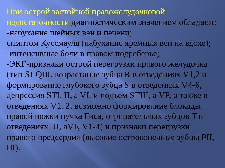 При острой застойной правожелудочковой недостаточности диагностическим значением обладают: -набухание шейных вен и печени; симптом Куссмауля (набухание яремных вен на вдохе); -интенсивные боли в правом подреберье; -ЭКГ-признаки острой перегрузки правого желудочка (тип SI-QIII, возрастание зубца R в отведениях V 1, 2 и формирование глубокого зубца S в отведениях V 4 -6, депрессия STI, II, a VL и подъем STIII, a VF, а также в отведениях V 1, 2; возможно формирование блокады правой ножки пучка Гиса, отрицательных зубцов T в отведениях III, a. VF, V 1 -4) и признаки перегрузки правого предсердия (высокие остроконечные зубцы PII, III).