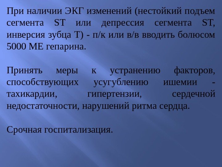 При наличии ЭКГ изменений (нестойкий подъем сегмента ST или депрессия сегмента ST, инверсия зубца Т) — п/к или в/в вводить болюсом 5000 ME гепарина. Принять меры к устранению факторов, способствующих усугублению ишемии — тахикардии, гипертензии, сердечной недостаточности, нарушений ритма сердца. Срочная госпитализация.