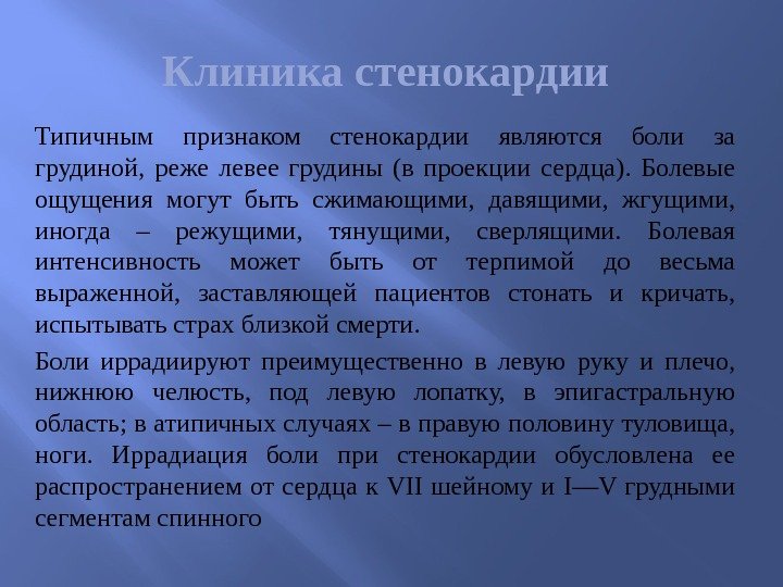 Клиника стенокардии Типичным признаком стенокардии являются боли за грудиной, реже левее грудины (в проекции сердца). Болевые ощущения могут быть сжимающими, давящими, жгущими, иногда – режущими, тянущими, сверлящими. Болевая интенсивность может быть от терпимой до весьма выраженной, заставляющей пациентов стонать и кричать, испытывать страх близкой смерти. Боли иррадиируют преимущественно в левую руку и плечо, нижнюю челюсть, под левую лопатку, в эпигастральную область; в атипичных случаях – в правую половину туловища, ноги. Иррадиация боли при стенокардии обусловлена ее распространением от сердца к VII шейному и I—V грудными сегментам спинного