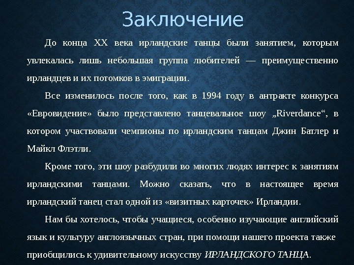 Заключение До конца XX века ирландские танцы были занятием, которым увлекалась лишь небольшая группа любителей — преимущественно ирландцев и их потомков в эмиграции. Все изменилось после того, как в 1994 году в антракте конкурса «Евровидение» было представлено танцевальное шоу „Riverdance“, в котором участвовали чемпионы по ирландским танцам Джин Батлер и Майкл Флэтли. Кроме того, эти шоу разбудили во многих людях интерес к занятиям ирландскими танцами. Можно сказать, что в настоящее время ирландский танец стал одной из «визитных карточек» Ирландии. Нам бы хотелось, чтобы учащиеся, особенно изучающие английский язык и культуру англоязычных стран, при помощи нашего проекта также приобщились к удивительному искусству ИРЛАНДСКОГО ТАНЦА.