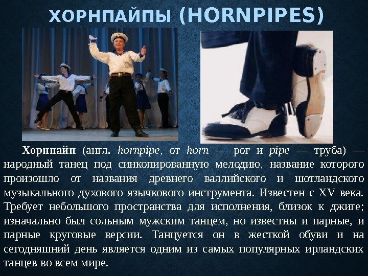 ХОРНПАЙПЫ (HORNPIPES) Хорнпайп (англ. hornpipe , от horn — рог и pipe — труба) — народный танец под синкопированную мелодию, название которого произошло от названия древнего валлийского и шотландского музыкального духового язычкового инструмента. Известен с XV века. Требует небольшого пространства для исполнения, близок к джиге; изначально был сольным мужским танцем, но известны и парные, и парные круговые версии. Танцуется он в жесткой обуви и на сегодняшний день является одним из самых популярных ирландских танцев во всем мире.