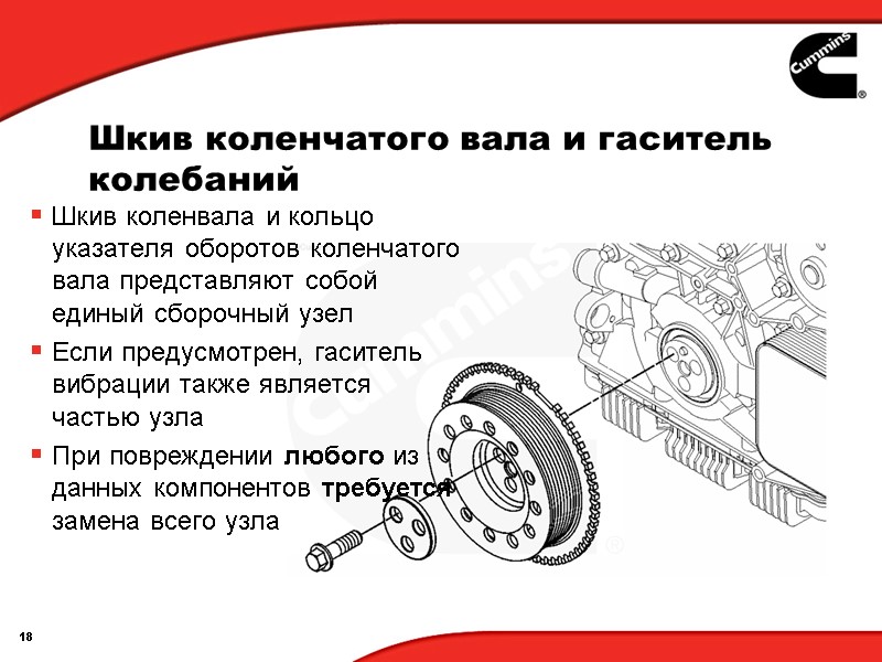 Шкив коленчатого вала и гаситель колебаний Шкив коленвала и кольцо указателя оборотов коленчатого вала представляют собой единый сборочный узел Если предусмотрен, гаситель вибрации также является частью узла При повреждении любого из данных компонентов требуется замена всего узла