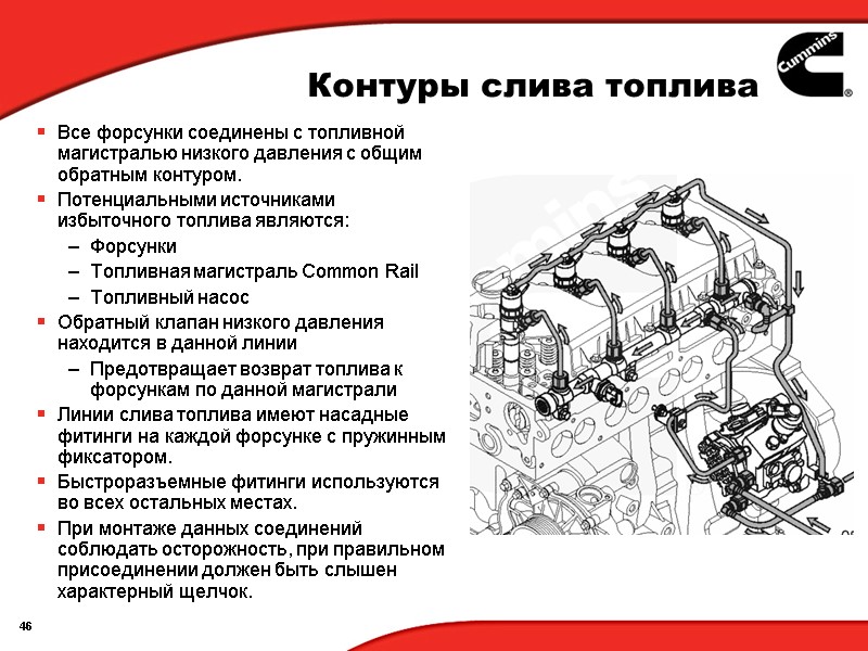 Контуры слива топлива Все форсунки соединены с топливной магистралью низкого давления с общим обратным контуром. Потенциальными источниками избыточного топлива являются: Форсунки Топливная магистраль Common Rail Топливный насос Обратный клапан низкого давления находится в данной линии Предотвращает возврат топлива к форсункам по данной магистрали Линии слива топлива имеют насадные фитинги на каждой форсунке с пружинным фиксатором. Быстроразъемные фитинги используются во всех остальных местах. При монтаже данных соединений соблюдать осторожность, при правильном присоединении должен быть слышен характерный щелчок.