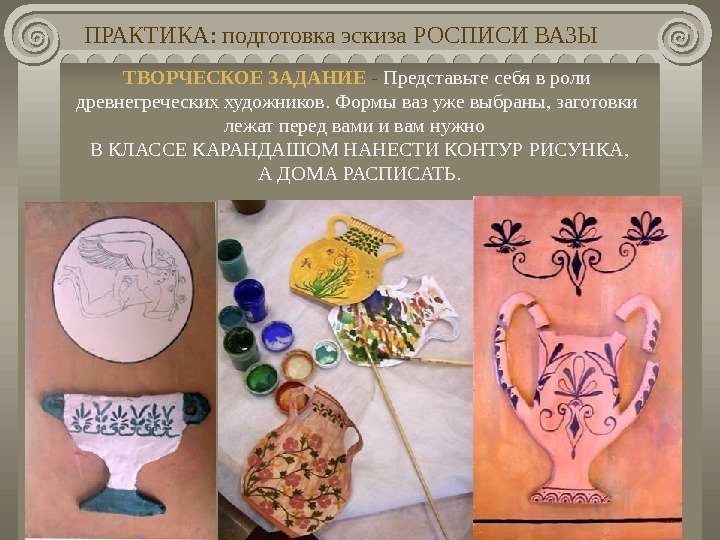ПРАКТИКА: подготовка эскиза РОСПИСИ ВАЗЫ ТВОРЧЕСКОЕ ЗАДАНИЕ — Представьте себя в роли древнегреческих художников. Формы ваз уже выбраны, заготовки лежат перед вами и вам нужно В КЛАССЕ КАРАНДАШОМ НАНЕСТИ КОНТУР РИСУНКА, А ДОМА РАСПИСАТЬ.