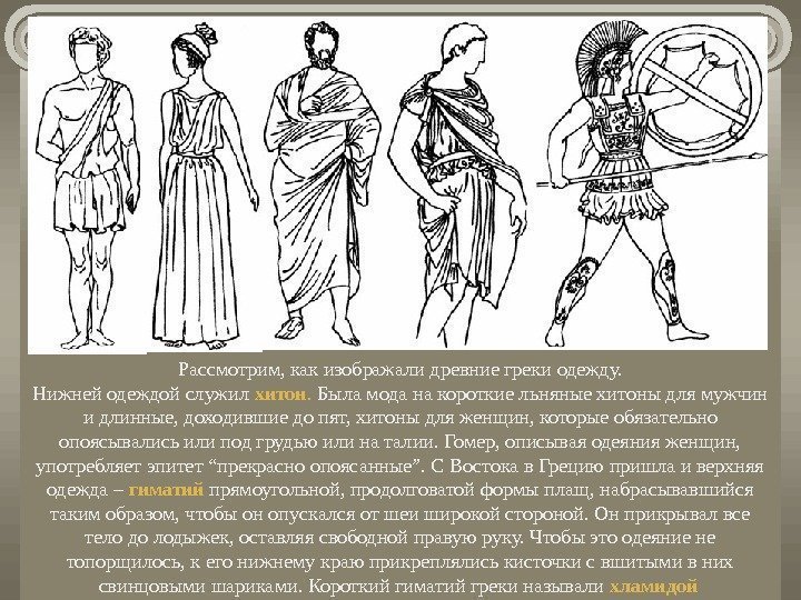Рассмотрим, как изображали древние греки одежду. Нижней одеждой служил хитон. Была мода на короткие льняные хитоны для мужчин и длинные, доходившие до пят, хитоны для женщин, которые обязательно опоясывались или под грудью или на талии. Гомер, описывая одеяния женщин, употребляет эпитет “прекрасно опоясанные”. С Востока в Грецию пришла и верхняя одежда – гиматий прямоугольной, продолговатой формы плащ, набрасывавшийся таким образом, чтобы он опускался от шеи широкой стороной. Он прикрывал все тело до лодыжек, оставляя свободной правую руку. Чтобы это одеяние не топорщилось, к его нижнему краю прикреплялись кисточки с вшитыми в них свинцовыми шариками. Короткий гиматий греки называли хламидой