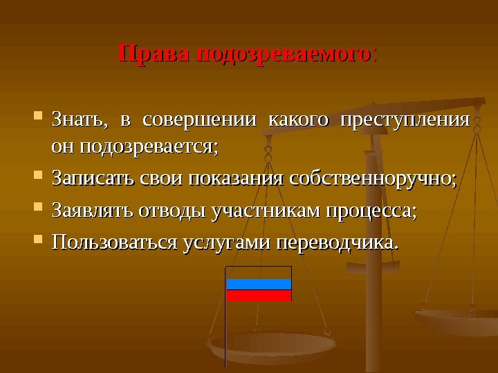 Права подозреваемого : : Знать, в совершении какого преступления он подозревается; Записать свои показания собственноручно; Заявлять отводы участникам процесса; Пользоваться услугами переводчика.