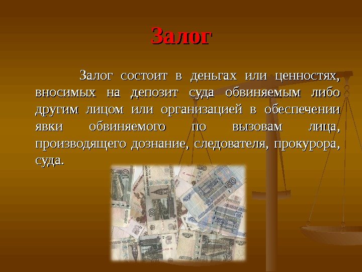 Залог Залог состоит в деньгах или ценностях, вносимых на депозит суда обвиняемым либо другим лицом или организацией в обеспечении явки обвиняемого по вызовам лица, производящего дознание, следователя, прокурора, суда.