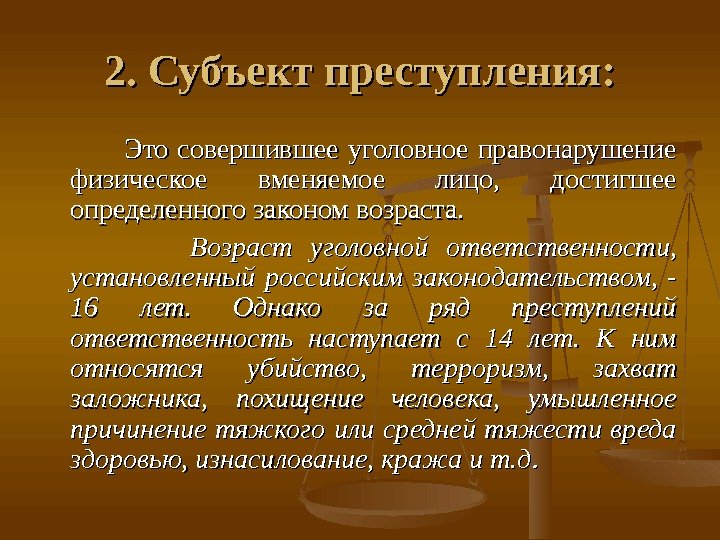 2. Субъект преступления: Это совершившее уголовное правонарушение физическое вменяемое лицо, достигшее определенного законом возраста. Возраст уголовной ответственности, установленный российским законодательством, — 16 лет. Однако за ряд преступлений ответственность наступает с 14 лет. К ним относятся убийство, терроризм, захват заложника, похищение человека, умышленное причинение тяжкого или средней тяжести вреда здоровью, изнасилование, кража и т. д. .