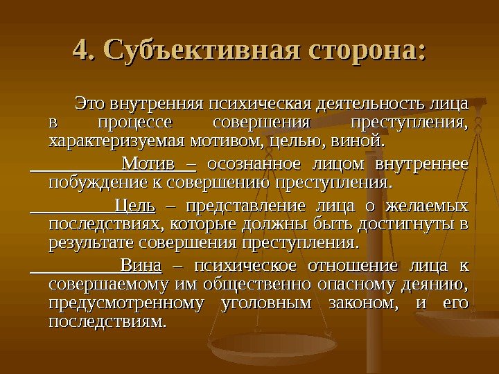 4. Субъективная сторона: Это внутренняя психическая деятельность лица в процессе совершения преступления, характеризуемая мотивом, целью, виной. Мотив – осознанное лицом внутреннее побуждение к совершению преступления. Цель – представление лица о желаемых последствиях, которые должны быть достигнуты в результате совершения преступления. Вина – психическое отношение лица к совершаемому им общественно опасному деянию, предусмотренному уголовным законом, и его последствиям.