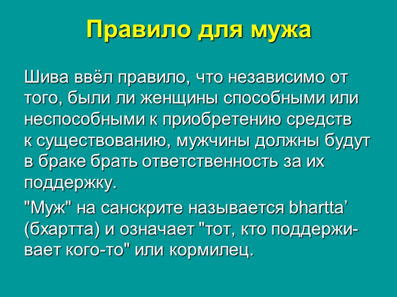 Правило для мужа Шива ввёл правило, что независимо от того, были ли женщины способными или неспособными к приобретению средств к существованию, мужчины должны будут в браке брать ответственность за их поддержку. "Муж" на санскрите называется bhartta’ (бхартта) и означает "тот, кто поддержи-вает кого-то" или кормилец.