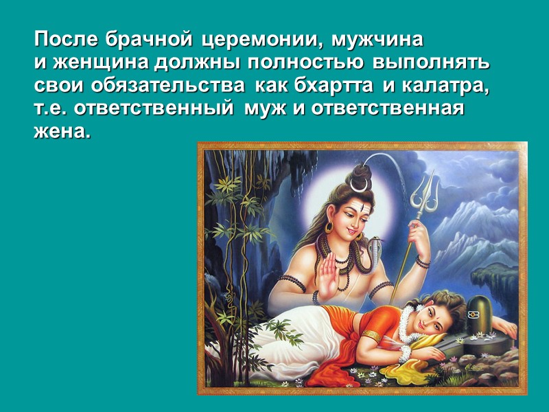 После брачной церемонии, мужчина и женщина должны полностью выполнять свои обязательства как бхартта и калатра, т.е. ответственный муж и ответственная жена.