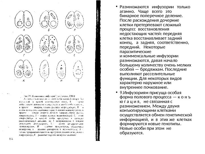 • Размножаются инфузории только агамно. Чаще всего это бинарное поперечное деление. После расхождения дочерние клетки претерпевают сложный процесс восстановления недостающих частей: передняя клетка восстанавливает задний конец, а задняя, соответственно, передний. Некоторые паразитические и комменсальные инфузории размножаются, давая начало большому количеству очень мелких особей — бродяжкам. Последние выполняют расселительные функции. Для некоторых видов характерно наружное или внутреннее почкование. • 9. Инфузориям присуща особая форма полового процесса — к о н ъ ю г а ц и я, не связанная с размножением. Между двумя конъюгирующими клетками осуществляется обмен генетической информацией, и в этих же клетках формируются новые генотипы. Новые особи при этом не образуются.