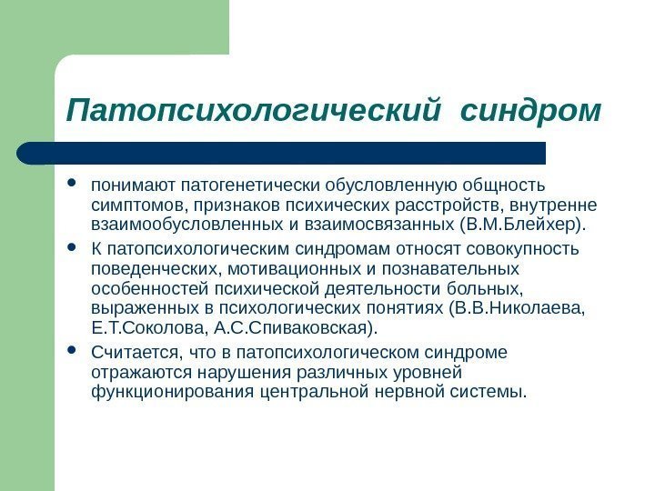 Патопсихологический синдром понимают патогенетически обусловленную общность симптомов, признаков психических расстройств, внутренне взаимообусловленных и взаимосвязанных (В. М. Блейхер). К патопсихологическим синдромам относят совокупность поведенческих, мотивационных и познавательных особенностей психической деятельности больных, выраженных в психологических понятиях (В. В. Николаева, Е. Т. Соколова, А. С. Спиваковская). Считается, что в патопсихологическом синдроме отражаются нарушения различных уровней функционирования центральной нервной системы.